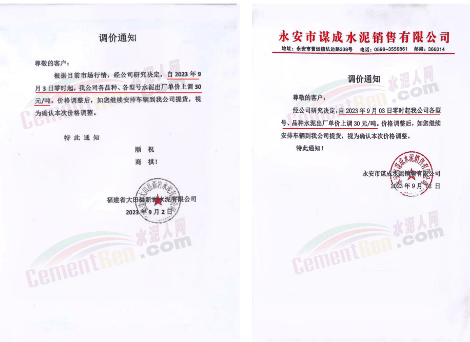 永信水泥分別于9月6日和16日通知上調(diào)水泥價格,累計上調(diào)80元/噸。