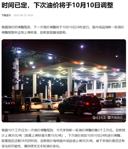 近來有消息稱,下一輪油價將于10月10日進行調(diào)整。根據(jù)10個工作日為一次油價調(diào)整規(guī)則,目前預(yù)計上調(diào)35元/噸(距離上調(diào)標(biāo)準(zhǔn)只差15元/噸)。下次油價將在10月10日24時進行調(diào)整。距離現(xiàn)在還剩10幾天的時間,目前預(yù)計每噸國內(nèi)成品油上調(diào)35元/噸。