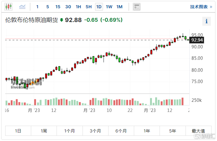 由于沙特阿拉伯和俄羅斯分別宣布延續(xù)減產(chǎn)減供措施,國際石油庫存走低推升了供不應(yīng)求的焦慮心態(tài)。近期國際油價盤中一度創(chuàng)下10個月以來新高,美油一度漲至93美元/桶,布油也一度突破95美元/桶。自今年6月以來,布倫特原油價格累計上漲超28%。