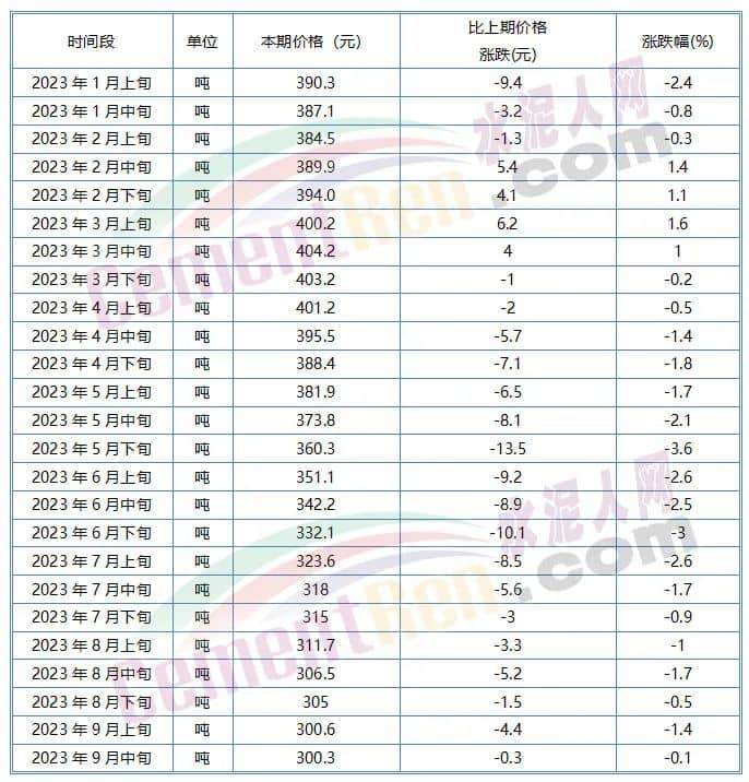 從近期國家統(tǒng)計局公布的數(shù)據(jù)可見,流通領(lǐng)域水泥價格連續(xù)下跌已放緩。流通區(qū)域普通硅酸鹽水泥(P.O42.5散裝)9月中旬報價300.3元/噸,為年內(nèi)最低價。且從3月下旬開始連續(xù)18期下跌,從5月上旬開始連續(xù)14期創(chuàng)年內(nèi)低點。較本年高點404.2元/噸,相差103.9元/噸??上驳氖墙诘照?.1%,為年內(nèi)最低跌幅,這也意味著即將回升的趨勢。