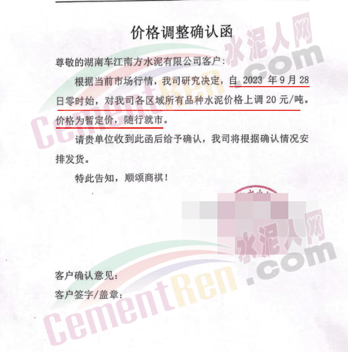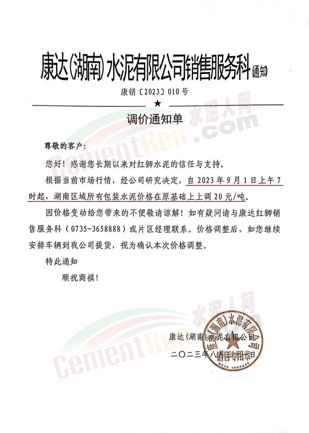 日前,重慶某品牌水泥渝東營銷中心秀山銷售部通知,根據周邊市場形勢,原燃材料持續攀升導致生產成本不斷增加,經公司研究決定從2023年9月27日12時開始對花垣、保靖、龍山區域各品種水泥出廠價格上調20元/噸。