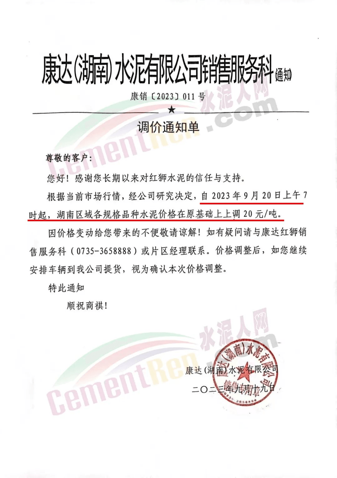 紅獅水泥旗下康達(湖南)水泥有限公司分別于9月1日,9月20日,9月28日連續三次通知上調水泥報價,累計上調60元/噸。
