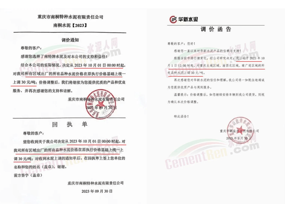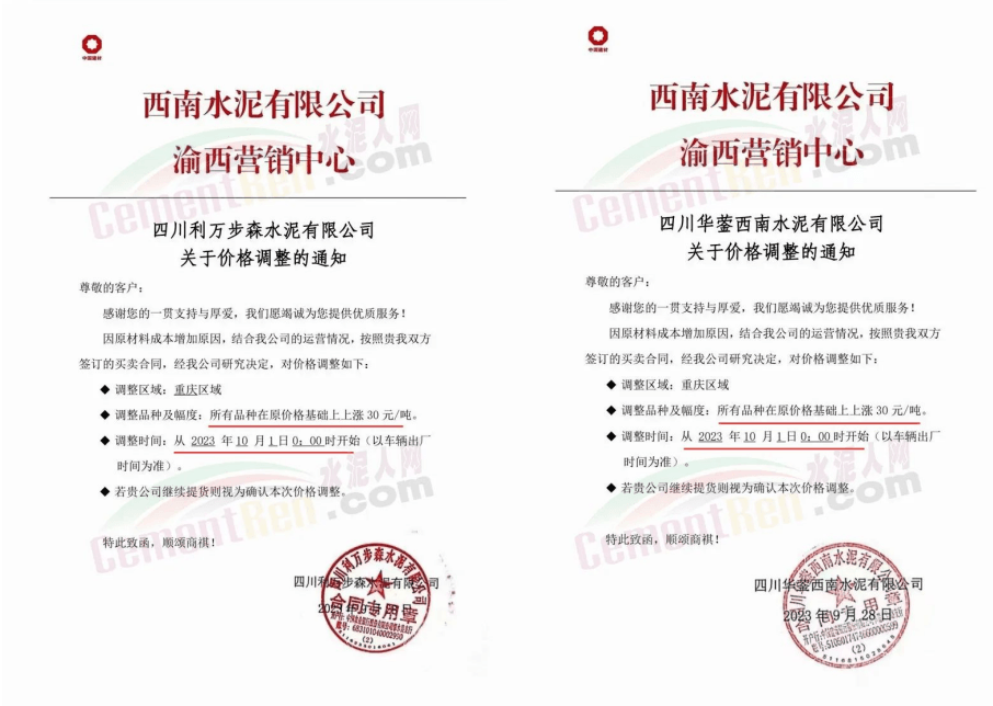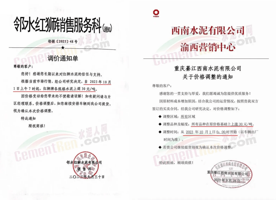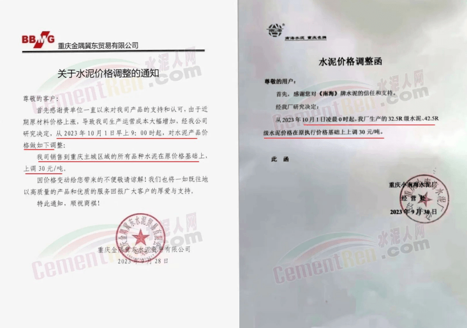 10月1日重慶金隅冀東、華新水泥、紅獅水泥、西南水泥渝西營(yíng)銷中心等主要品牌企業(yè)通知,上調(diào)水泥價(jià)格30元/噸。