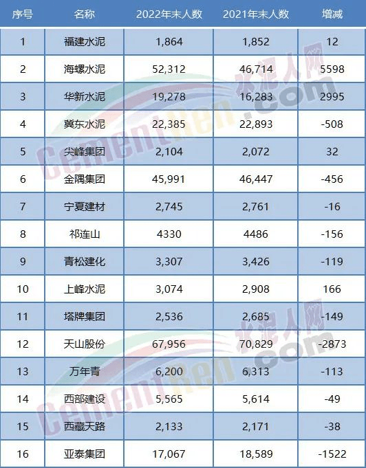 據上市企業公開數據,從2019~2022年金隅集團、冀東水泥、亞泰集團員工都有千人以上的減員,萬年青、祁連山、塔牌水泥均有百人以上的減員。2021~2022年金隅集團、冀東水泥、萬年青、祁連山、塔牌集團、青松建化等均有百人以上的減員,冀東水泥減員達500多人。然而,從水泥行業未來發展來看,這才是剛剛開始。