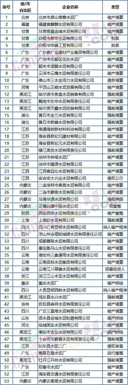 水泥人網注意到,近兩個月以來公布相關消息的水泥企業中,有的企業破產后欠付員工社保;有的企業員工成為企業債權人;有的因欠供應商貨款被申請破產清算;還有的連累兄弟企業與其一起破產……