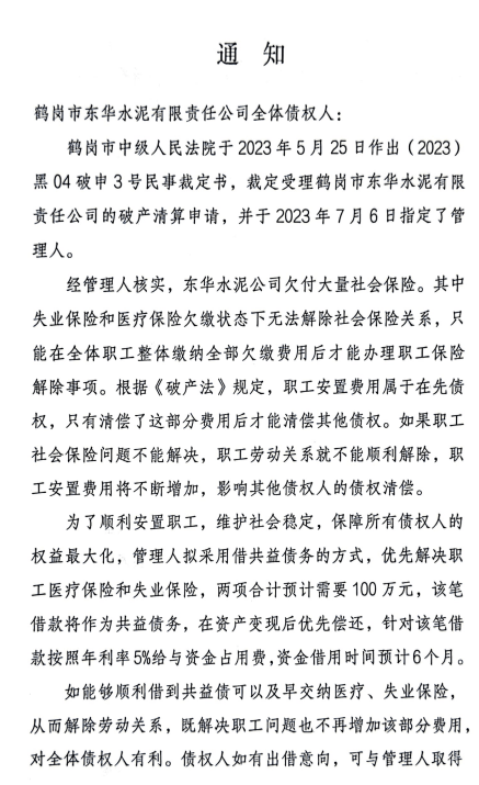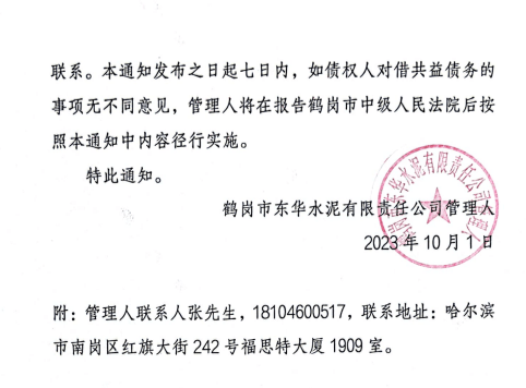 鶴崗市中級人民法院已于今年5月裁定受理鶴崗市東華水泥有限責任公司的破產清算申請,并于2023年7月6日指定了管理人。