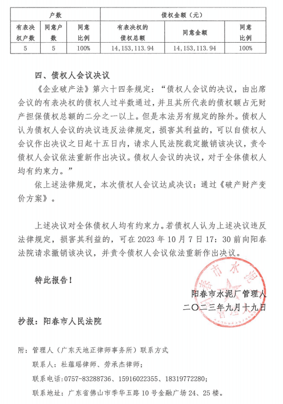 陽春市水泥廠破產清算,債務人3:2通過《破產財產變價方案》的報告