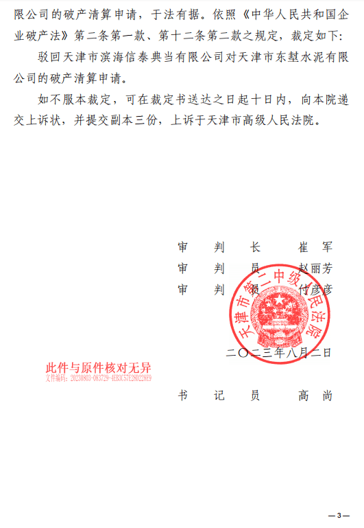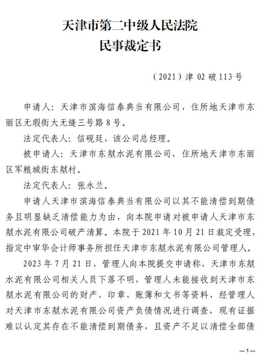 2023年7月21日,管理人向天津市第二中級人民法院提交申請稱,天津市東堼水泥有限公司相關人員下落不明,管理人未能接收到天津市東堼水泥有限公司的財產、印章、賬簿和文書等資料,經管理人依法對天津市東堼水泥有限公司的資產負債情況進行調查,該廠仍有資產,現難以認定其存在破產原因。法院于8月2日裁定駁回天津市濱海信泰典當有限公司對天津市東堼水泥有限公司的破產清算申請。