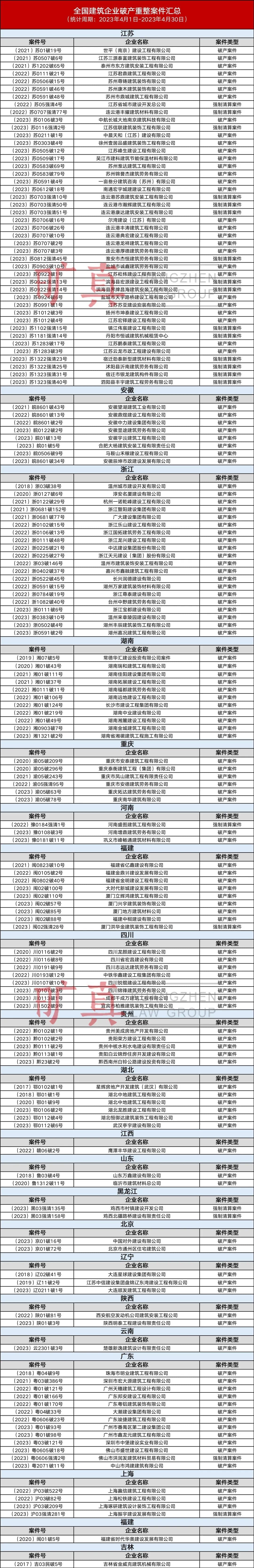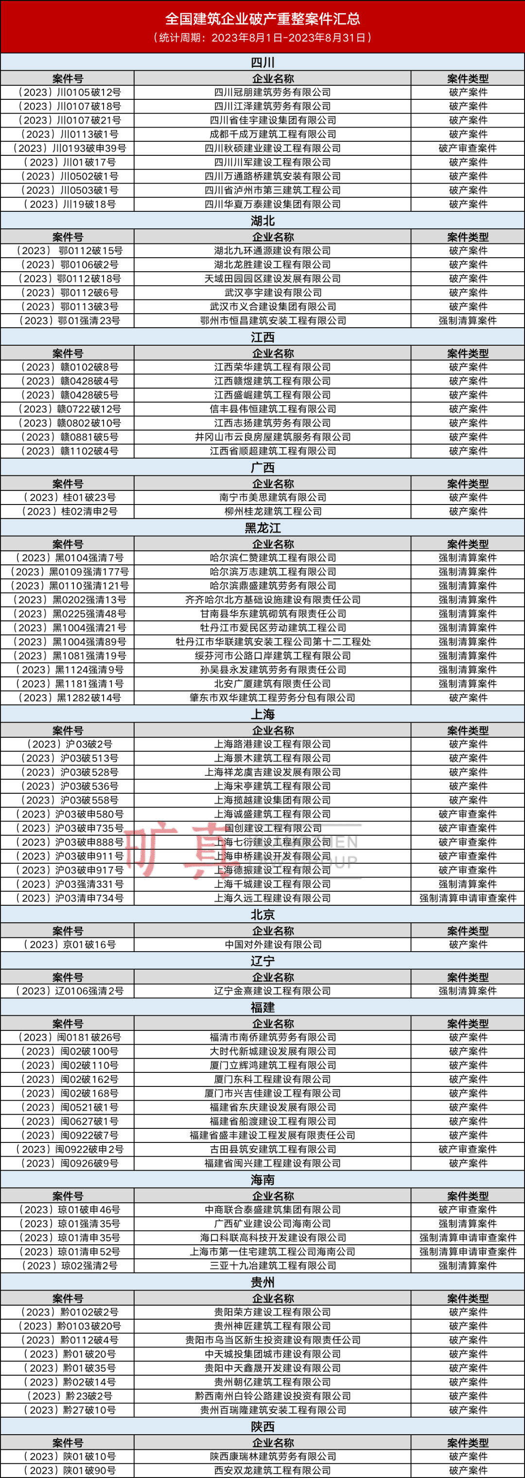 附2023年1-8月全國建筑企業破產重整案件匯總