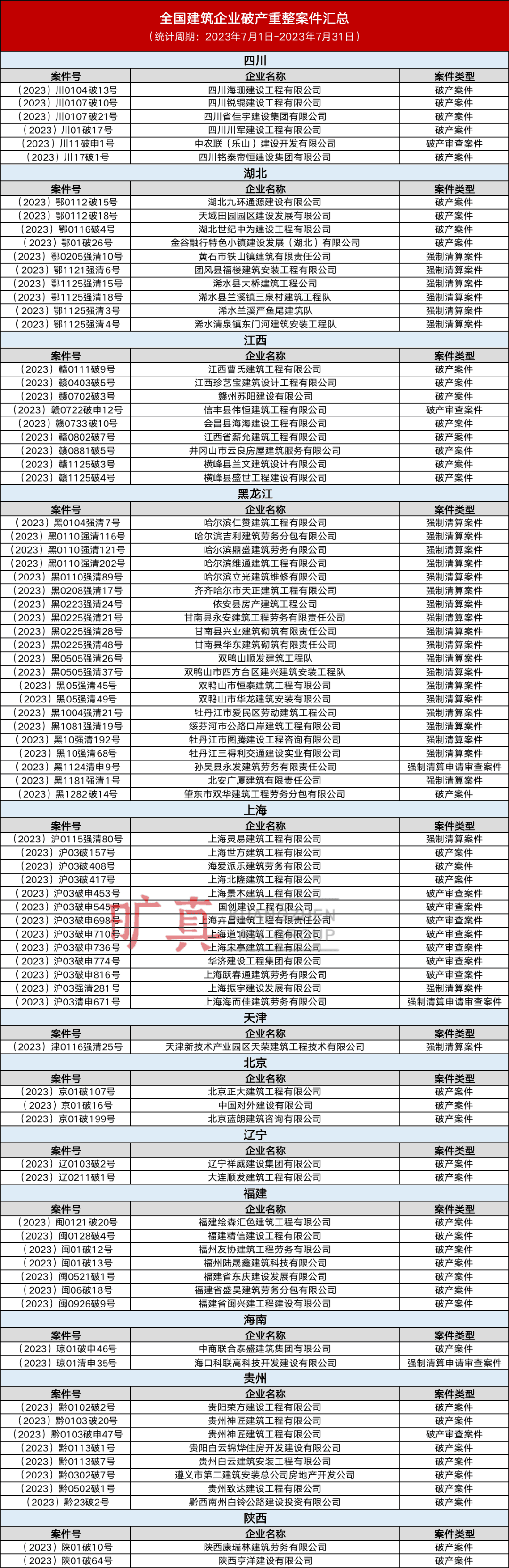 從2023年1-8月全國建筑企業破產重整案件匯總名單(見附件)可見,占比較大的仍是江蘇省。一位項目經理介紹稱,老家江蘇,一個縣就有好幾家特級總承包。而今這些“特級”也都已經入列破產名單了,這些破產公司的員工絕大多數都回鄉了。