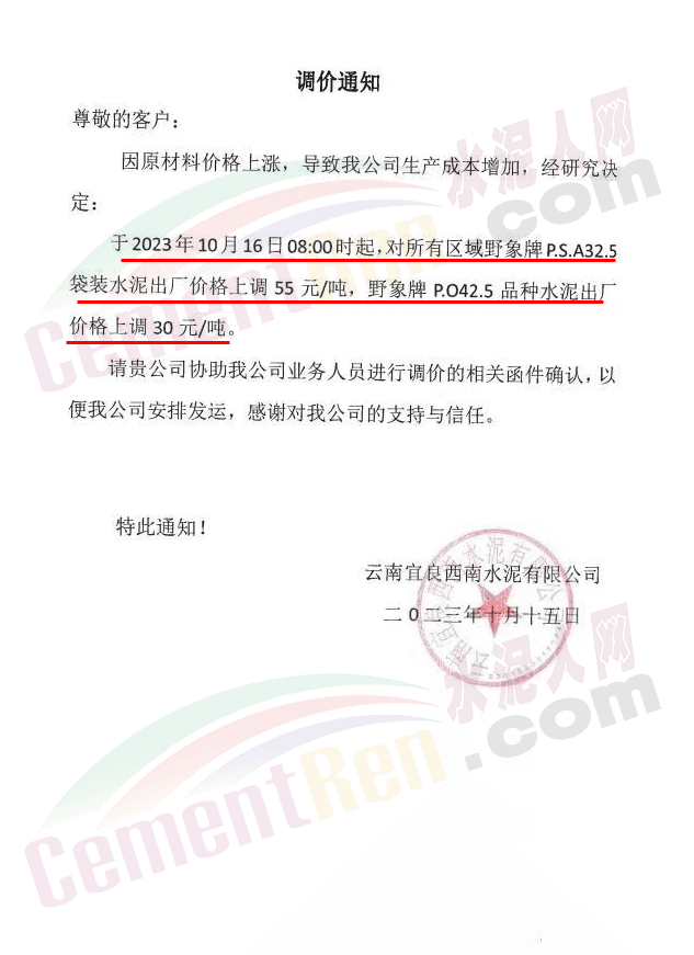 云南宜良西南水泥有限公司通知,因原材料價格上漲,導致公司生產成本增加,經研究決定于2023年10月16日8時起對所有區域野象牌P.S.A32.5袋裝水泥出廠價格上調55元/噸,野象牌P.O42.5品種水泥出廠價格上調30元/噸。