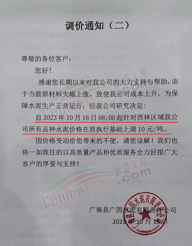 云南文山州廣南縣廣固水泥有限公司通知,由于當前原材料大幅上漲,致使公司成本上升,為保障水泥生產正常運行,經公司研究決定,自2023年10月16日8時起,對西林區域我公司所有品種水泥價格在原執行基礎上調10元/噸。