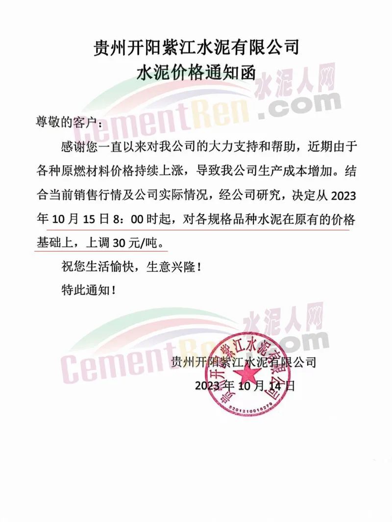 廣西桂林修文縣蘇達新型環保材料有限公司通知,根據目前市場發展形勢,結合公司生產經營情況,經公司研究決定,自2023年10月15日0時起,對黔恒大各品種水泥價格在原價格基礎上上調30元/噸。