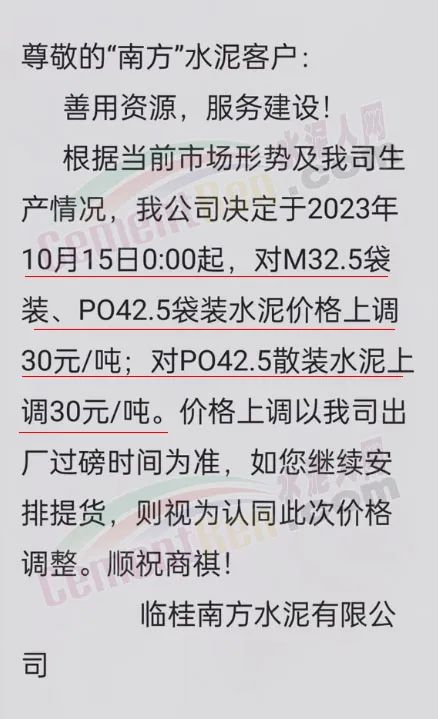 廣西桂林臨桂南方水泥有限公司通知,2023年10月15日0時起,各標號水泥上調30元/噸。