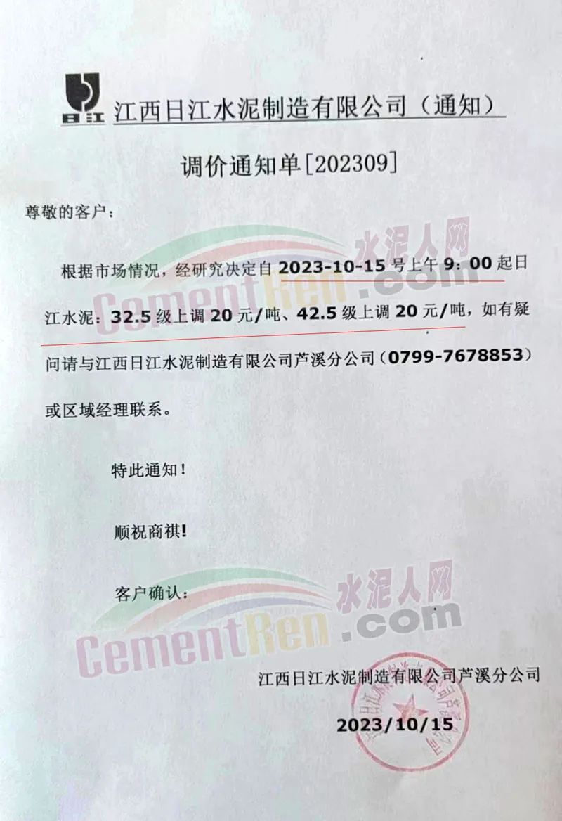 江西日江水泥制造有限公司通知,根據市場情況,經研究決定自2023年10月15日上午9時起各標號水泥價格上調20元/噸。