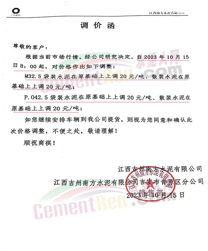 江西吉州南方水泥吉安青原區分公司通知,根據當前市場行情,經公司研究決定,自2023年10月15日8時起,各標號水泥上調20元/噸。