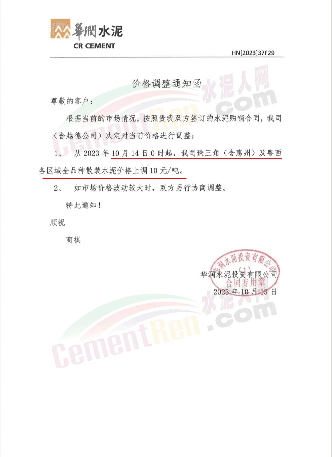 此前在各區域建立直銷機制,并報出市場較低價的華潤水泥通知,自10月14日起,公司珠三角(含惠州)及粵西各區域全品種散裝水泥價格上調10元/噸。