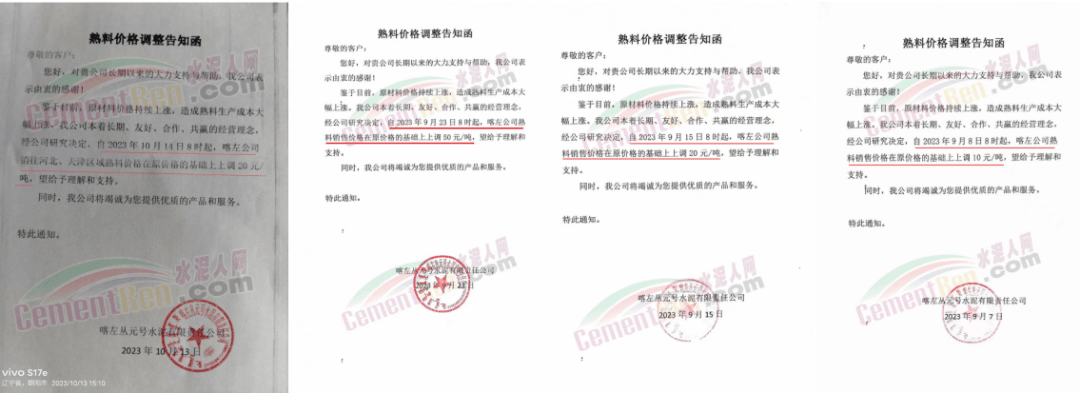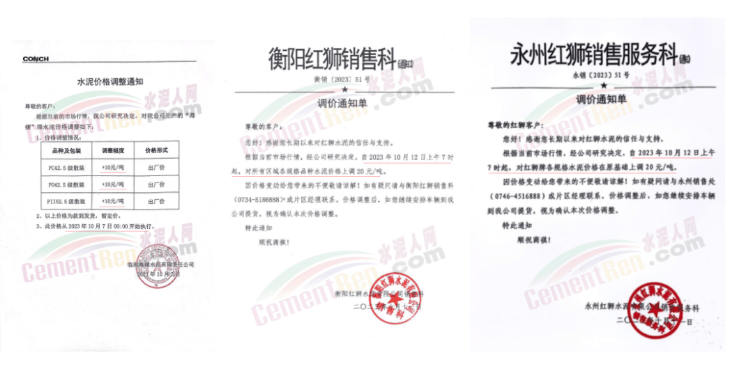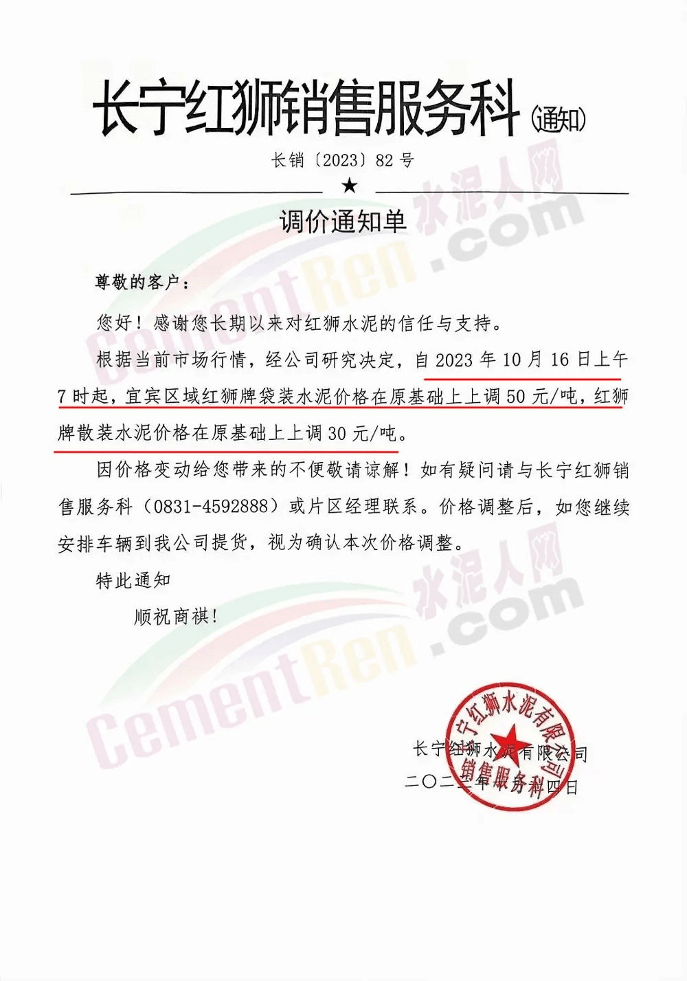 15日前后,四川區域主要品牌企業紅獅、西南等主要品牌企業通知上調水泥報價30-50元/噸。四川長寧紅獅銷售服務科通知,自2023年10月16日起,宜賓區域紅獅牌水泥上調30-50元/噸。