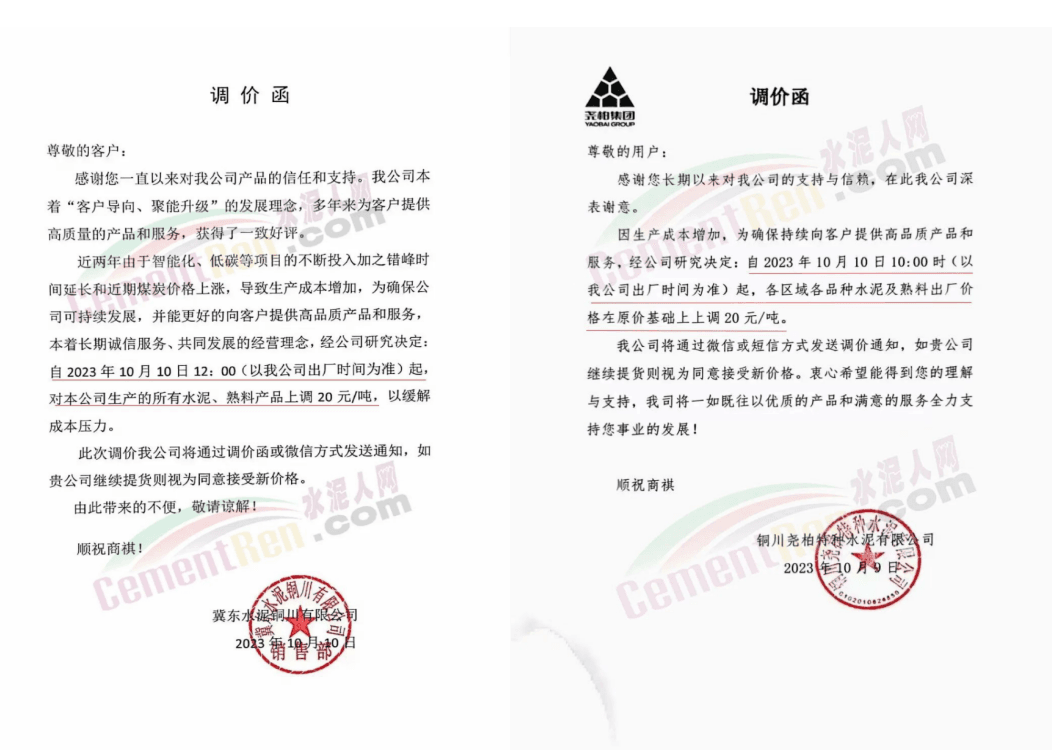 廣西新建線企業錦象水泥通知,因原材料價格上漲,導致公司成本增加,經研究決定,于2023年10月14日起,各品種包、散水泥價格上調20元/噸。