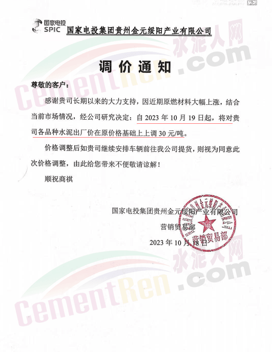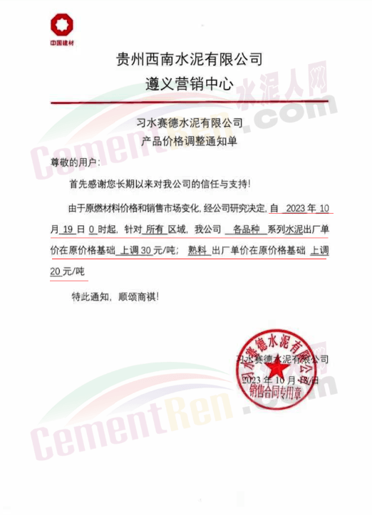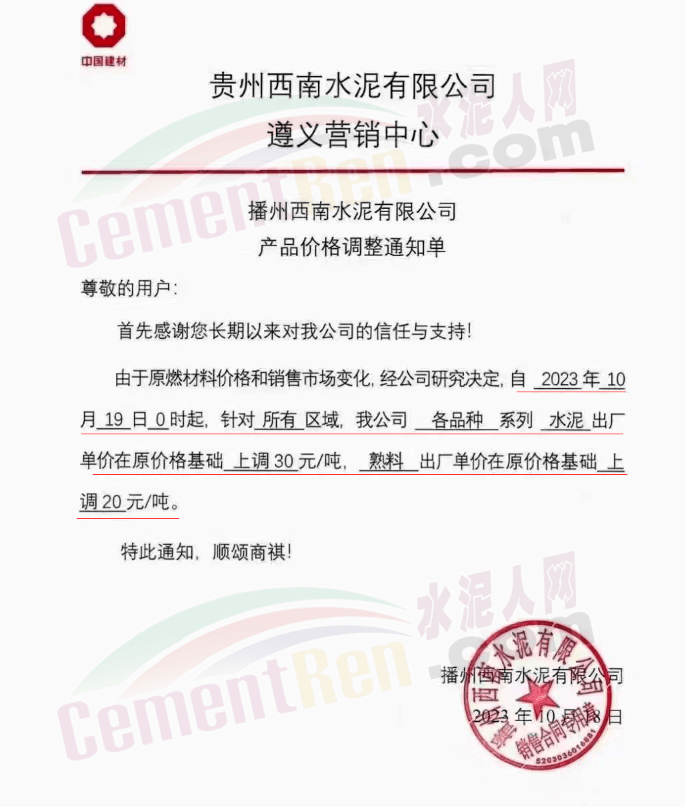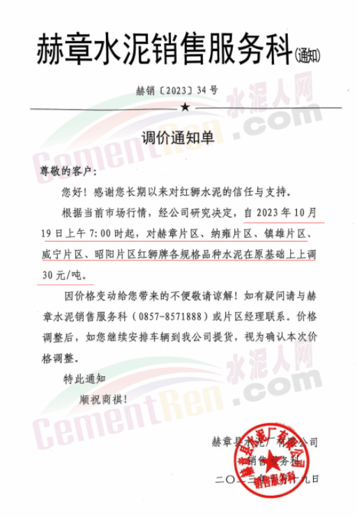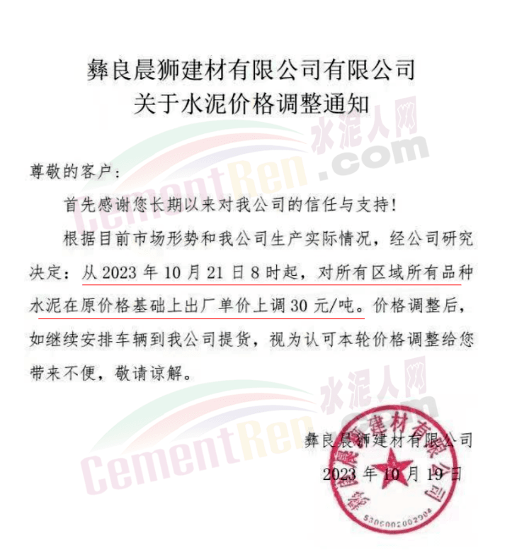 云南省昭通市彝良晨獅建材有限公司通知,根據目前市場形勢和公司生產實際情況,經公司研究決定,從2023年10月21日8時起,對所有區域所有品種水泥價格上調30元/噸。