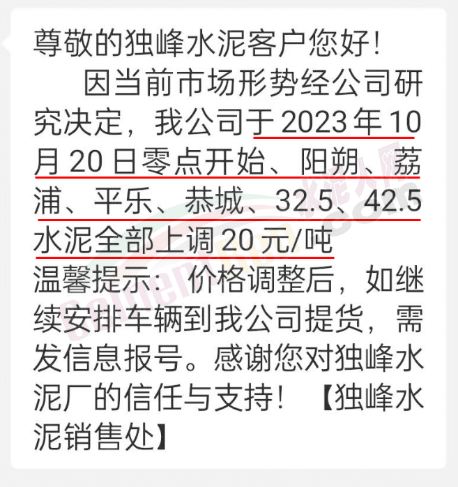 廣西桂林獨峰水泥通知,定于10月20日0時起,上調陽朔、荔浦、平樂、恭城、32.5、42.5水泥價格20元/噸。