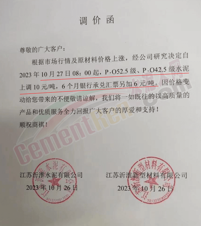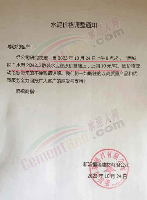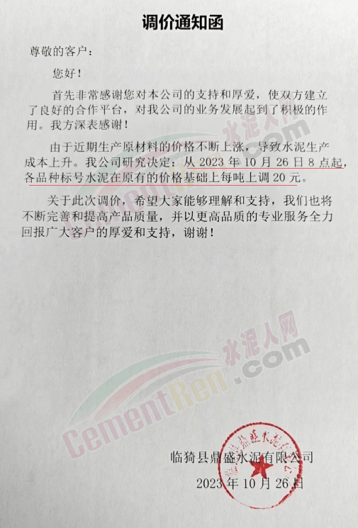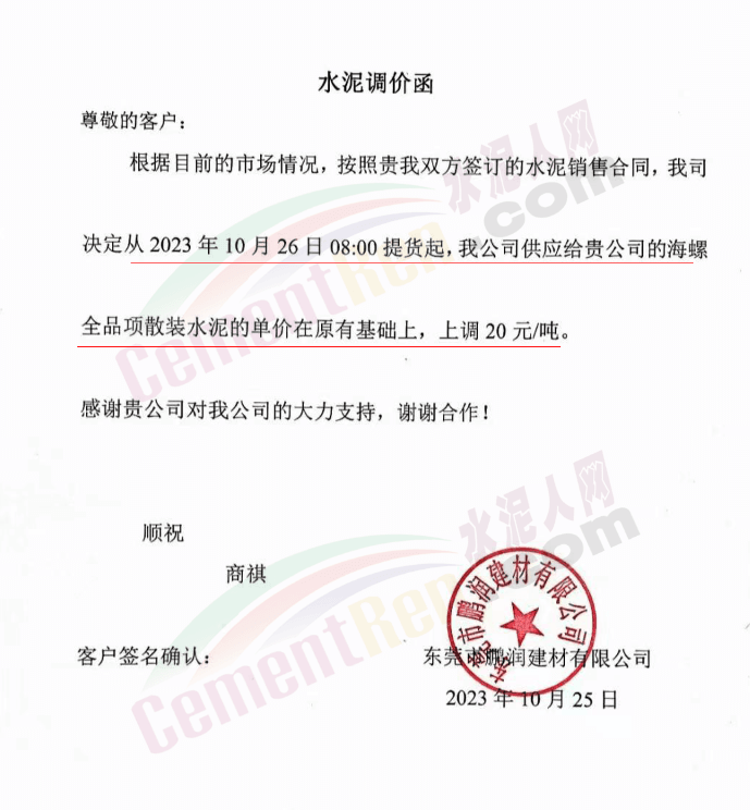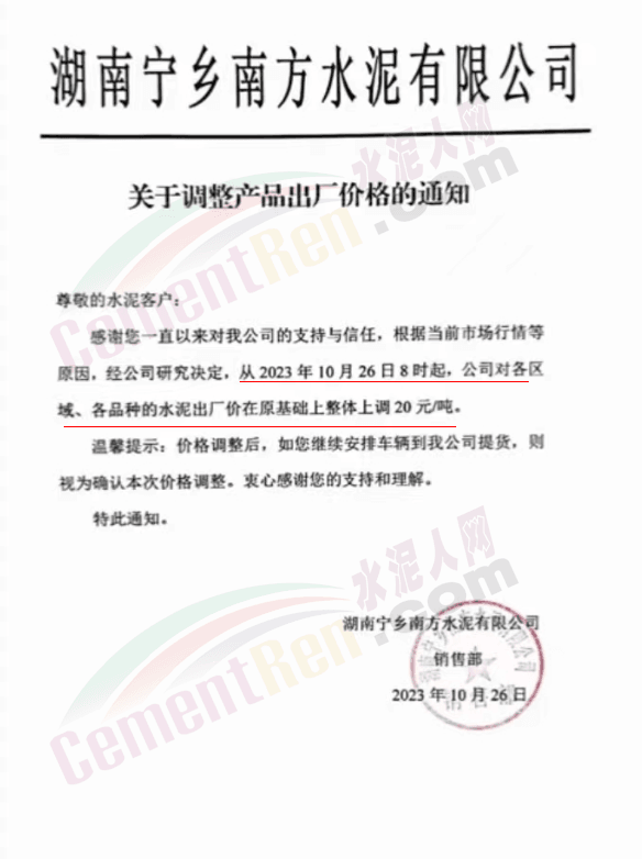 近來受原材料價格上漲和經濟政策的刺激,廣東、湖南、山西、陜西多地包括海螺水泥在內的多家品牌企業通知上調報價。廣東東莞鵬潤建材有限公司通知,根據目前的市場情況,從10月26日8時起公司供應的海螺全品項散裝水泥上調20元/噸。