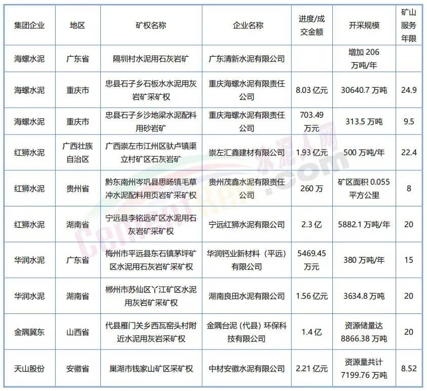 據(jù)水泥人網(wǎng)了解,今年以來(lái)行業(yè)頭部企業(yè)海螺水泥、紅獅水泥、金隅冀東、天山股份等企業(yè)均有在各地拿礦,擴(kuò)充現(xiàn)有產(chǎn)能資源。