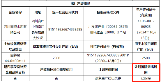 本次置換方案中,出讓方四川南威水泥有限公司生產許可證有效期至2024年10月13日,排污許可證有效期至2020年12月6日,截至本次變更方案公示,四川南威水泥有限公司生產許可證已過期5個月,排污許可證過期已超過4年