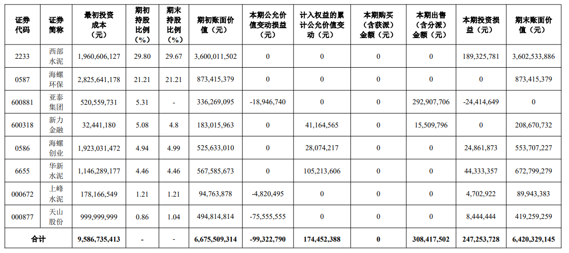 水泥人網注意到,海螺水泥2024年度報告中披露,海螺水泥除持有西部水泥股份外,還持有亞泰集團、華新水泥、上峰水泥、天山股份等企業股份,西部水泥為其持股比例最大的同行企業。