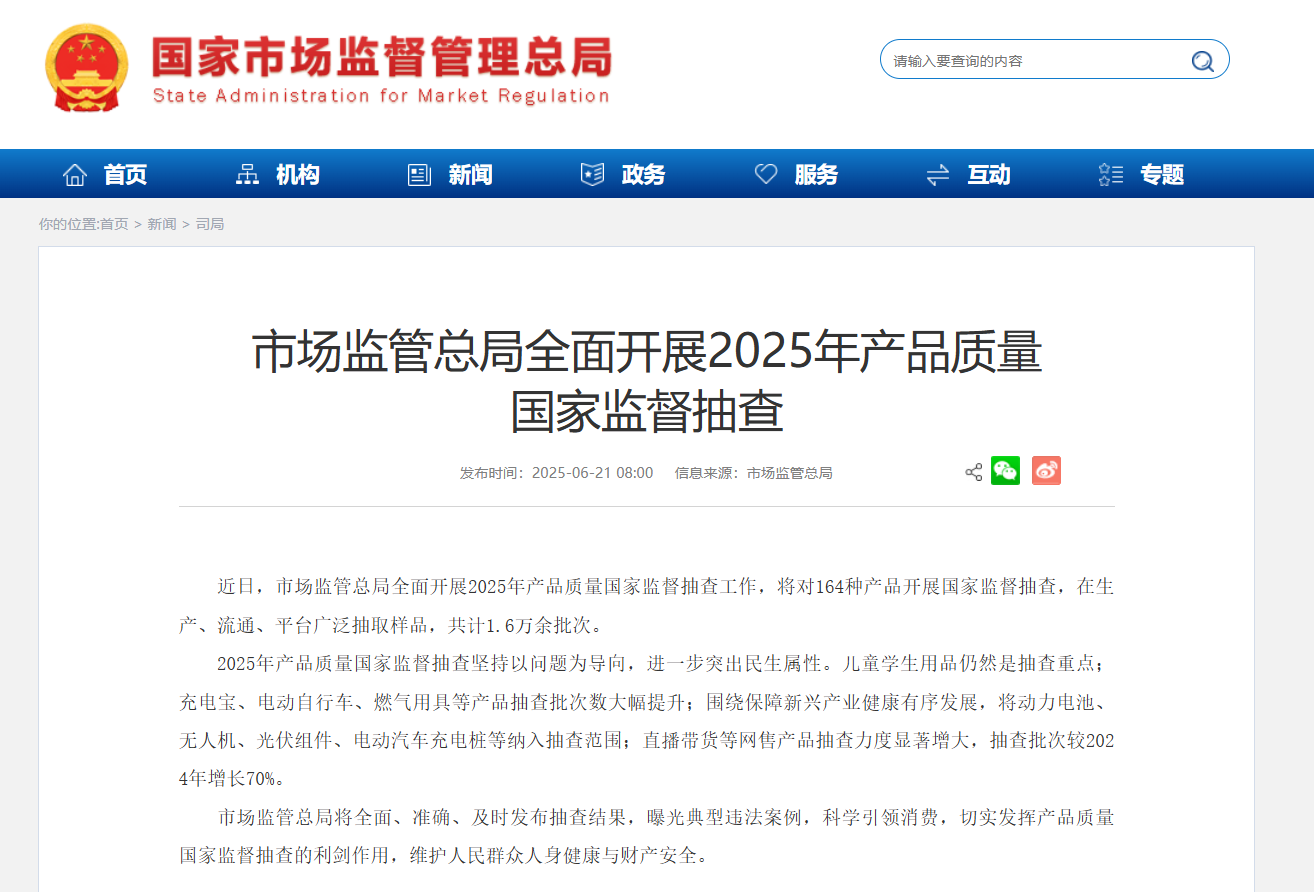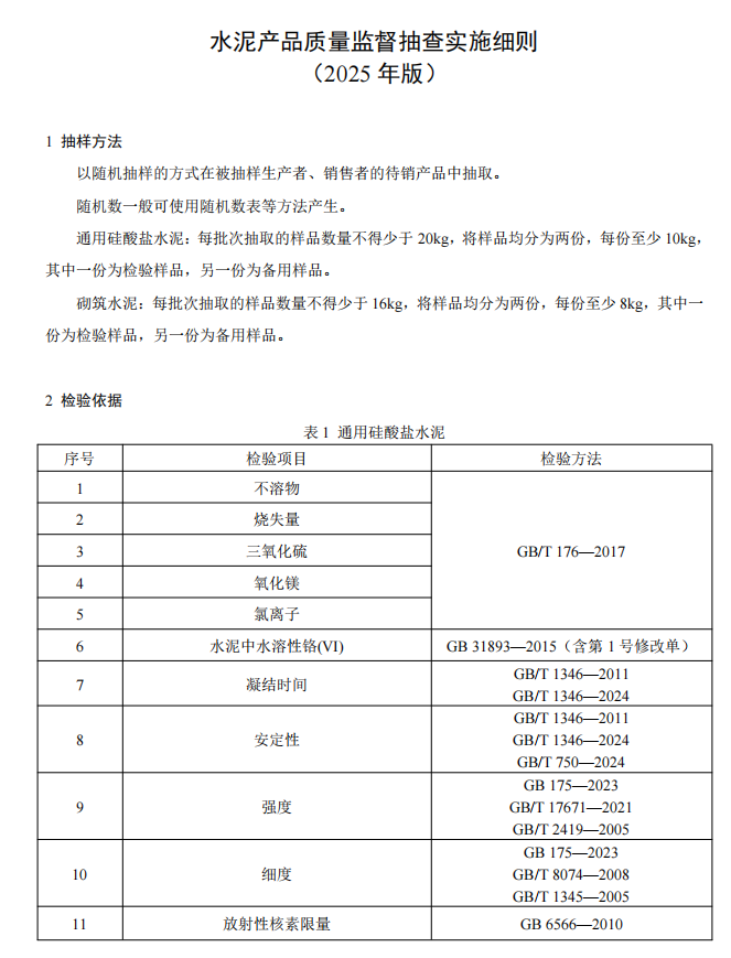 近日,市場監管總局全面開展2025年產品質量國家監督抽查工作,將對164種產品開展國家監督抽查,在生產、流通、平臺廣泛抽取樣品,共計1.6萬余批次。市場監管總局將全面、準確、及時發布抽查結果,曝光典型違法案例,科學引領消費,切實發揮產品質量國家監督抽查的利劍作用,維護人民群眾人身健康與財產安全。 水泥人網注意到,市場監管總局同期發布的還有水泥及熟料產品2025版產品質量監督抽查實施細則公告,并表示自發布之日起實施,各地市場監管部門在開展產品質量監督抽查時可直接采用。此前發布的同種產品監督抽查實施細則同時廢止。